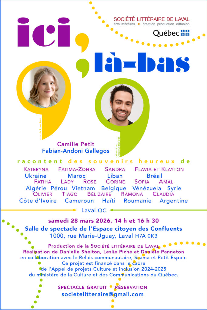 GRATUIT. Samedi 28 mars 2026, représentation à 14h (et, s’il y a surplus de réservations, à 16 h30), au Théâtre de l’Espace citoyen des Confluents, 1000 rue Marie-Uguay, Laval H7A 0K3 (quartier Saint-François).